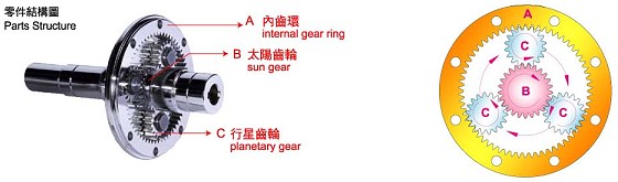 由一個內齒環(A)緊密結合於齒箱殼體上,環齒中心有一個自外部動力所驅動之太陽齒輪(B),