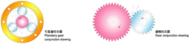 呈360度均佈衝擊負荷,可降低齒輪之磨擦更使齒輪無斷裂之虞。行星齒輪採浮遊式運動,期間隙相當密合,